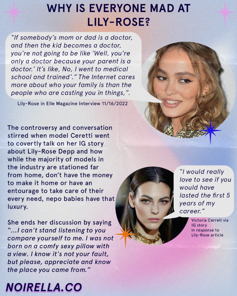 The controversy and conversation stirred when Ceretti went to covertly talk on her IG story about Lily-Rose Depp and how while the majority of models in the industry are stationed far from home, don’t have the money to make it home or have an entourage to take care of their every need, nepo babies have that luxury. She ends her discussion by saying “…I can’t stand listening to you compare yourself to me. I was not born on a comfy sexy pillow with a view. I know it’s not your fault, but please, appreciate and know the place you came from.” Ceretti believes that Depp wouldn’t “lasted through the first five years of my career.”